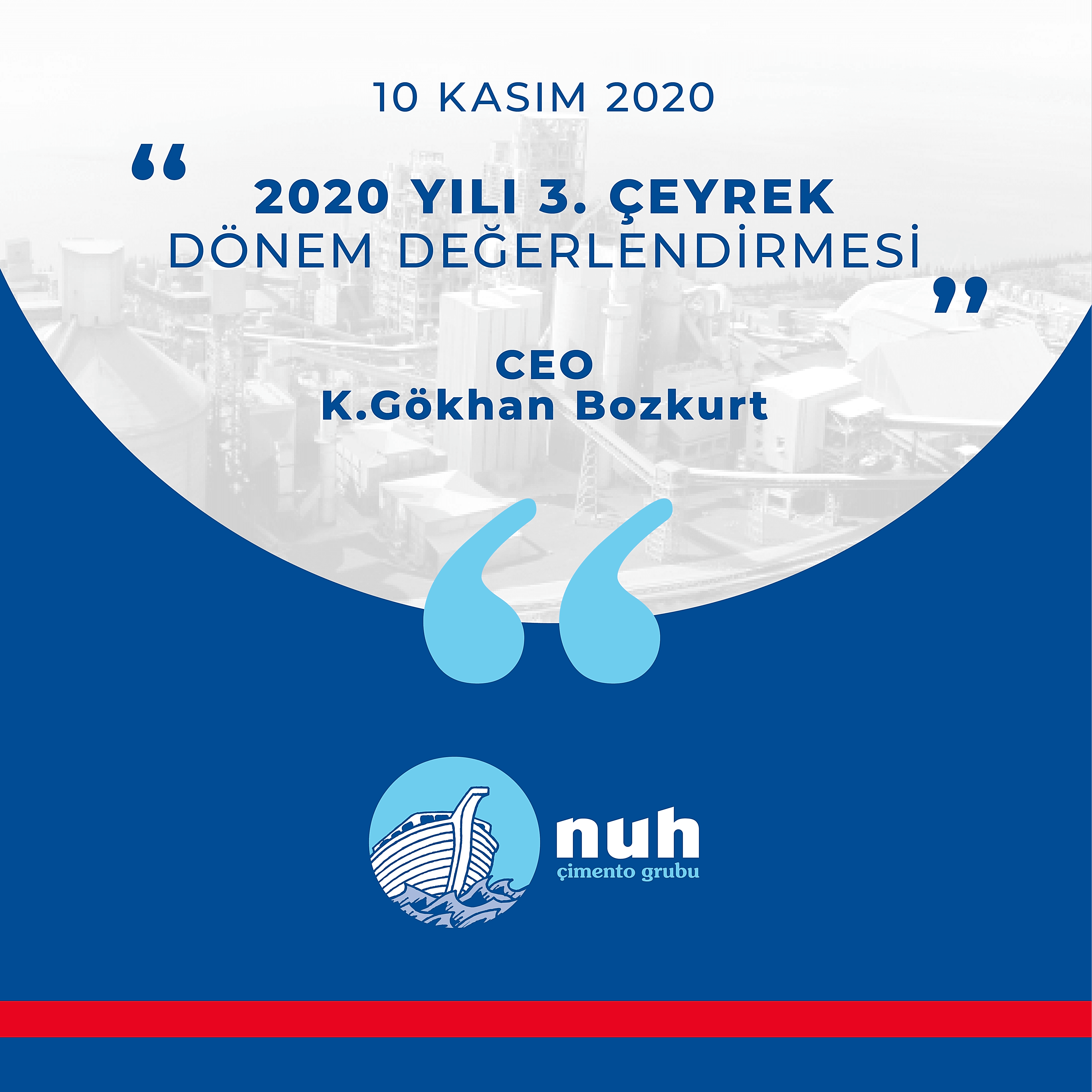 Türkiye Çimento Sektörünün Lideri olarak 2020 yılına damgasını vuran şirketimiz Nuh Çimento, geçen yıla göre cirosunu 981 Milyon TL’ den 1 Milyar 206 Milyon TL’ ye artırmış ve yüzdesel olarak da %23 oranında ciro artışını sağlamıştır. Brüt karımız da ise bu artış 224 Milyon TL’den 403 Milyon TL’ye çıkarak %80’lik rekor seviyede bir artış olmuştur. Yılın 3. çeyreğinde EBITDA’mız ise %76 artışla 200 Milyon TL’den 352 Milyon TL’ye yükselmiştir. EBITDA marjımızın Türkiye ortalamasının en az iki katına ulaşmasını bekliyoruz.